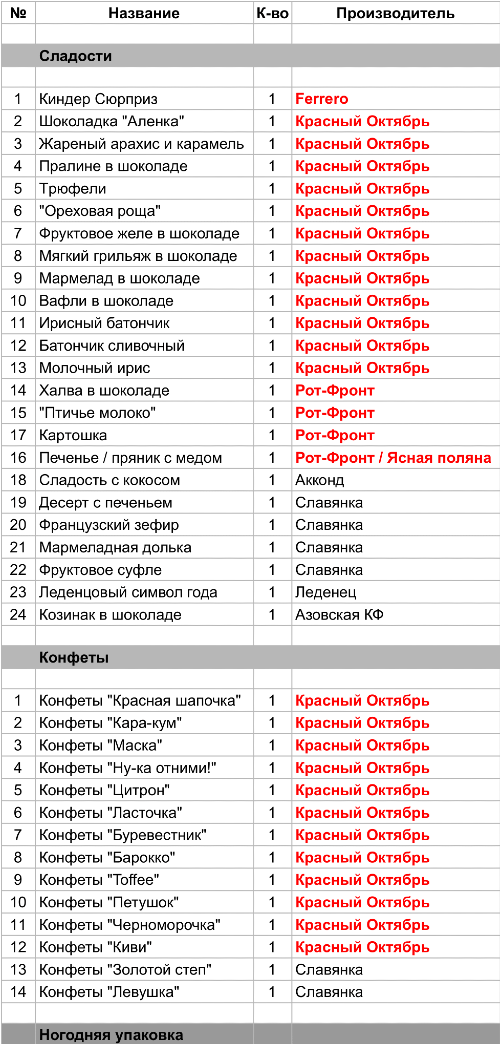 Шоколадка "Аленка" (1 шт), Жареный арахис и карамель (1 шт), Пралине в шоколаде (1 шт), Трюфели (1 шт), "Ореховая роща" (1 шт), Фруктовое желе в шоколаде (1 шт), Мягкий грильяж в шоколаде (1 шт), Мармелад в шоколаде (1 шт), Вафли в шоколаде (1 шт), Ирисный батончик (1 шт), Батончик сливочный (1 шт), Молочный ирис (1 шт), Конфеты "Красная шапочка" (1 шт), Конфеты "Кара-кум" (1 шт), Конфеты "Маска" (1 шт), Конфеты "Ну-ка отними!" (1 шт), Конфеты "Цитрон" (1 шт), Конфеты "Ласточка" (1 шт), Конфеты "Буревестник" (1 шт), Конфеты "Барокко" (1 шт), Конфеты "Toffee" (1 шт), Конфеты "Петушок" (1 шт), Конфеты "Черноморочка" (1 шт), Конфеты "Киви" (1 шт)